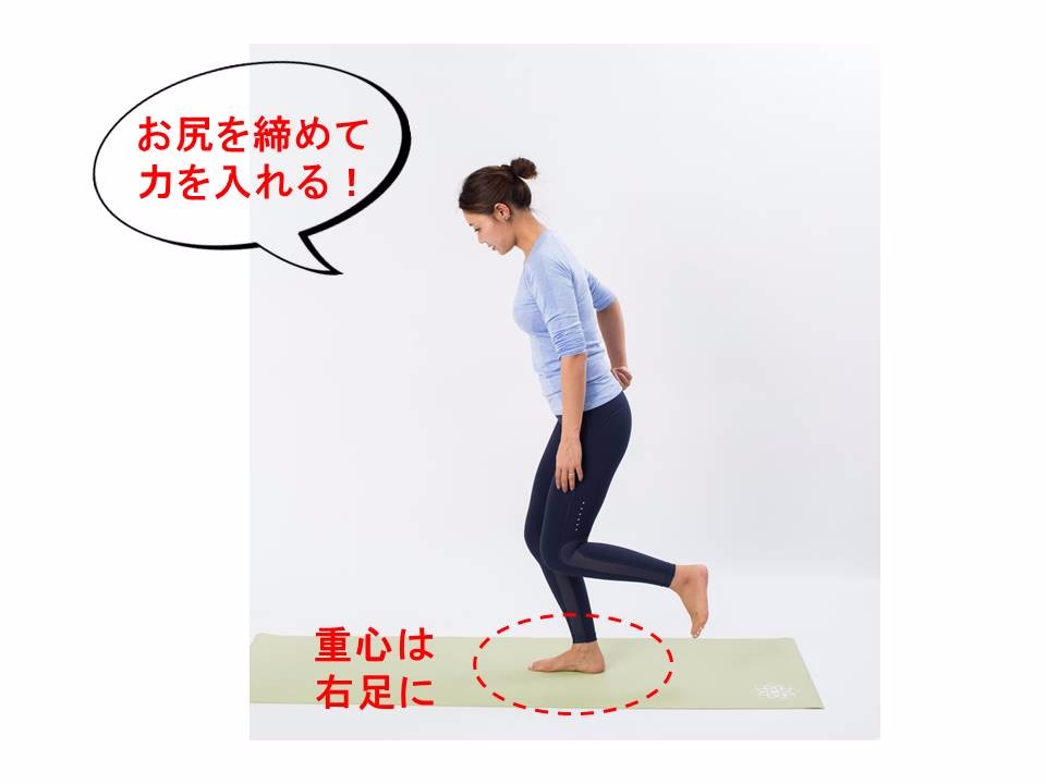 ❶軽く足を開いて立ち、左あしをかるくあげ、重心の右足をかるく曲げながらお尻をぷりっとつきだしこの時点で右のお尻に力をいれる。