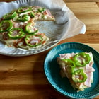 ⒉たまねぎ、ベーコン、ピーマンを重ね、ピザソースをかけてからチーズをのせます。
