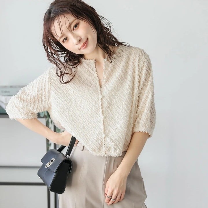 華やかさと抜け感を同時に叶える、上品な透け感が魅力のフリンジジャガードカーディガン。軽やかなシアー素材に、斜めにあしらったフリンジが動きを添え、着こなしに表情をプラスしてくれます。五分袖で気になる二の腕も自然にカバーしつつ、上品な肌見せも。ハイウエストボトムと好相性のショート丈で、スタイルアップ効果も抜群!春から夏にかけての羽織りに、着回し力の高い一枚です。