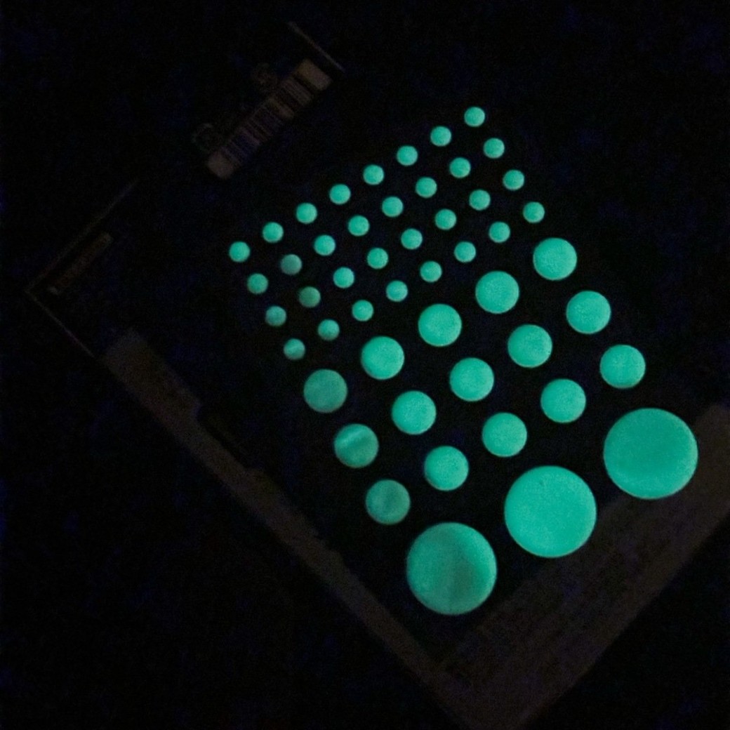 私が使用したのは「蓄光シール 丸型」という商品。大・中・小の3サイズが合計50個入っています。