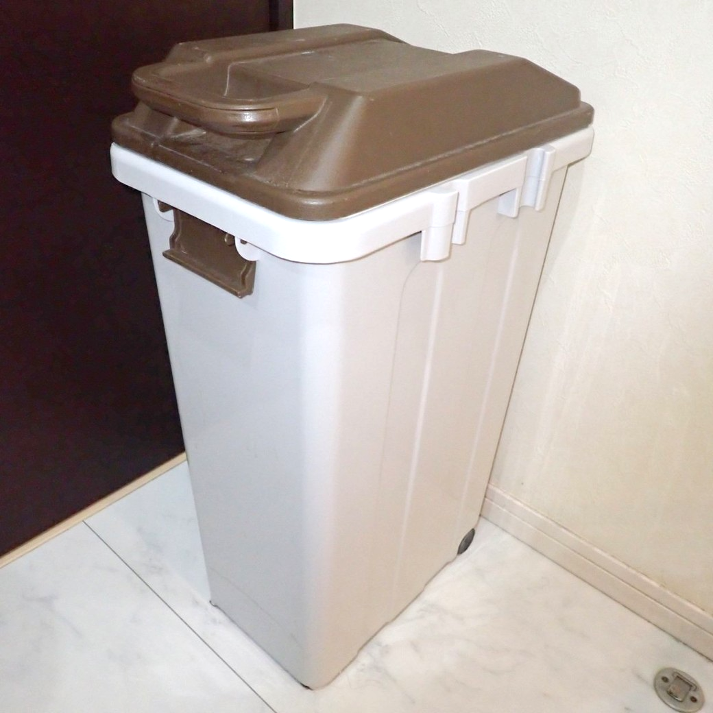 我が家で使用している台所に設置している45Lの燃えるゴミ用のゴミ箱。プラスチック製のどこにでもあるものですが、気づけばこのようにカビが発生。臭いもなかなかのレベルに仕上がっています。今回はこの残念なゴミ箱をカビも臭いも完全にリセットしていきますね。