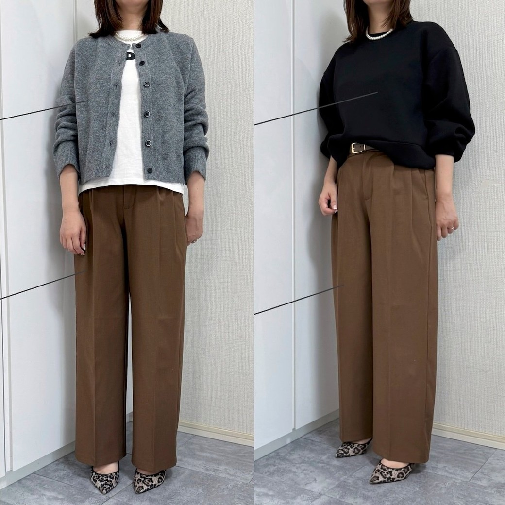 今回は、GUのタックワイドパンツのブラウンを着まわしています。