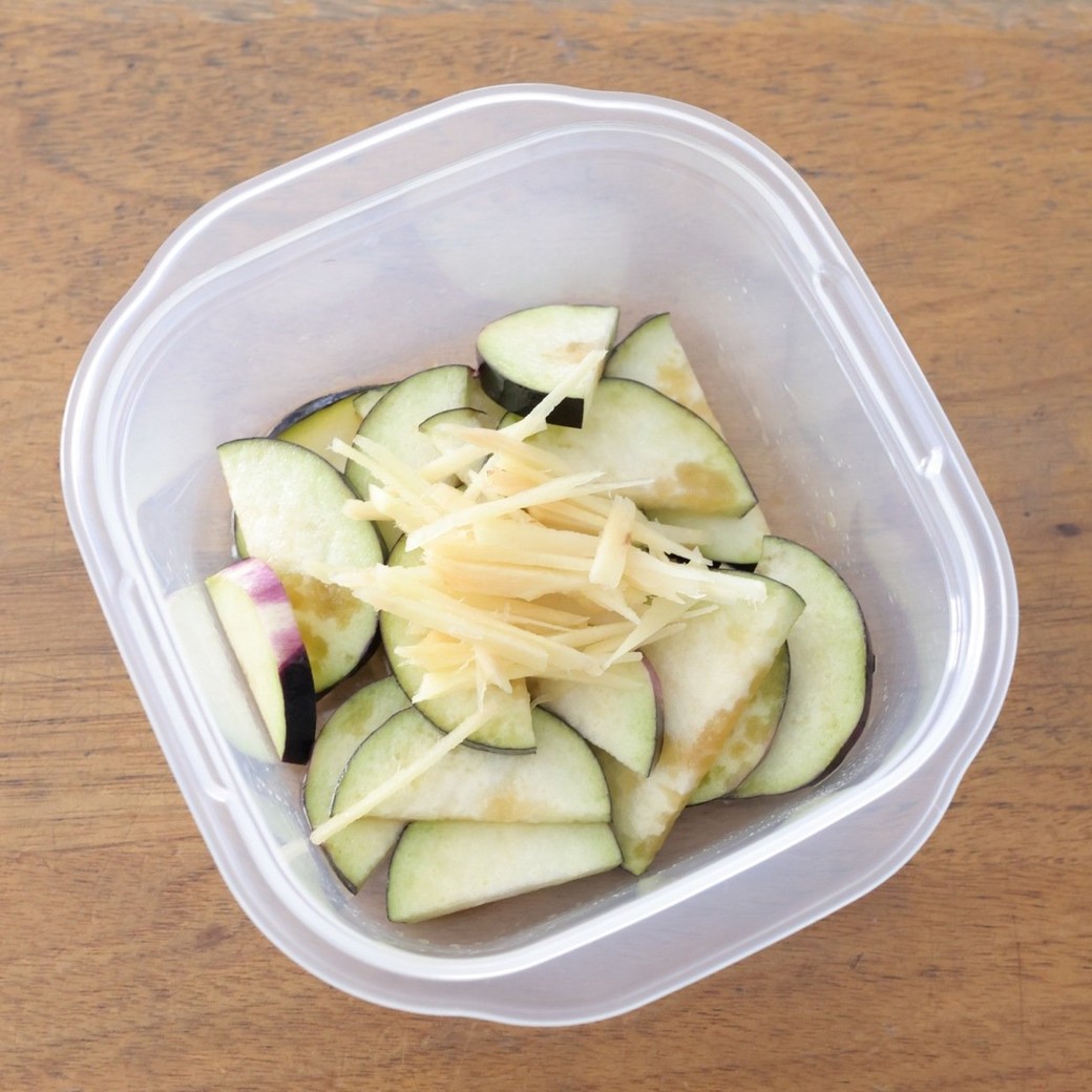 1.耐熱容器になすを入れ、ごま油をよく絡ませます。続いてしょうがとめんつゆも入れ、ラップを被せて、500Wの電子レンジで約1分(600Wでも同様)加熱します。