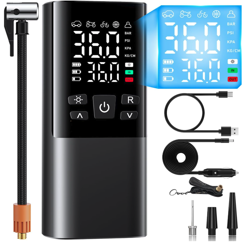 また、LCDのデジタルディスプレイで現在の空気圧がリアルタイム表示されるのも安心ポイント。「今、どれくらい入ってる?」がひと目でわかるのはうれしいですね。さらに、空気圧の単位はPSI・BAR・KPA・kg/cm²の4種類に切り替え可能。用途や好みに合わせて使えます。