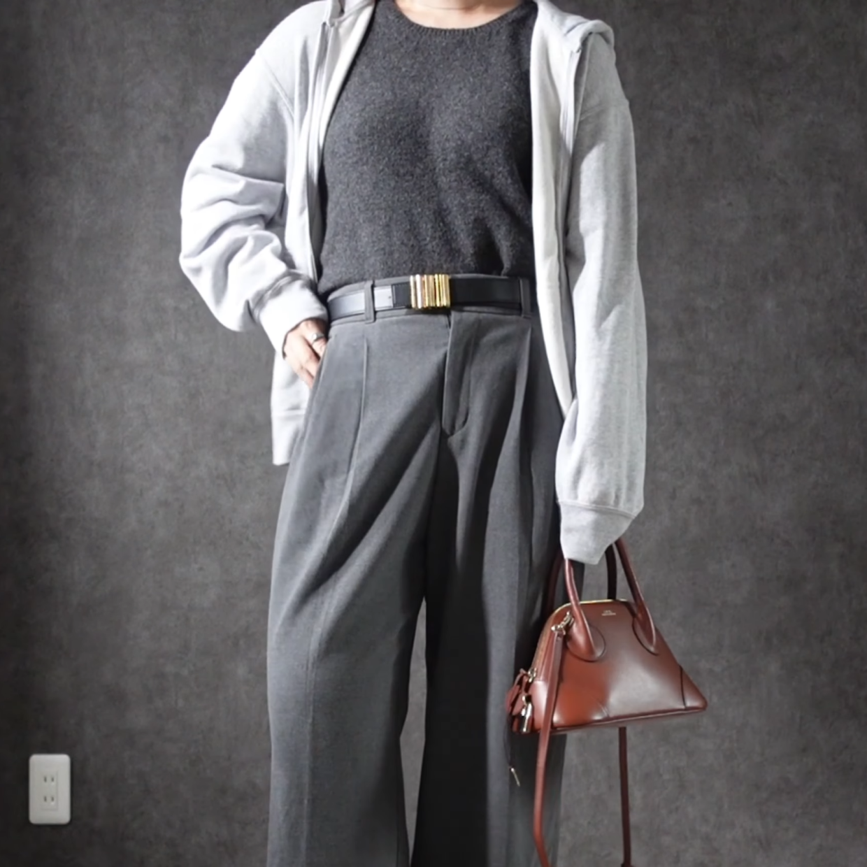 グレー×ブラウンの落ち着いたコーデです。