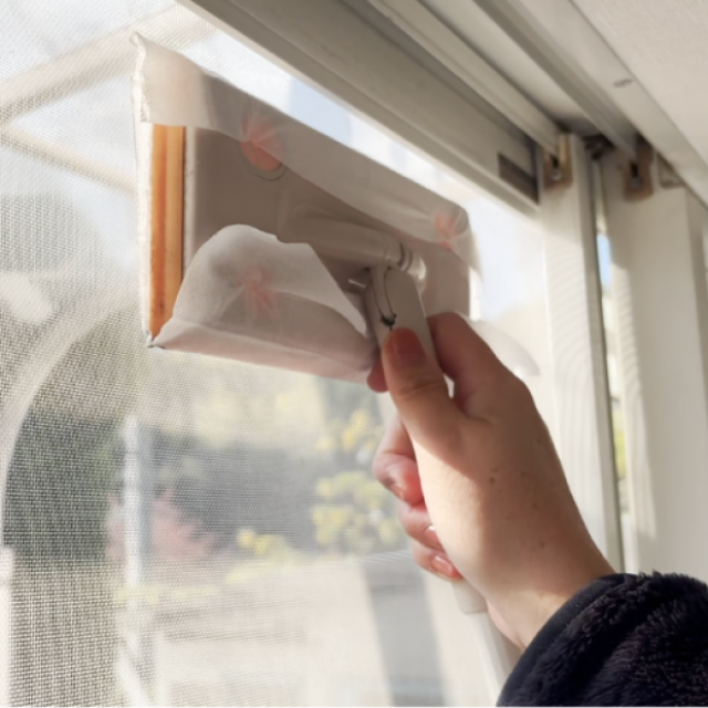 フロアワイパーに網戸用おそうじシートを取りつけ、上から下へやさしく拭きます。ここでも、内側から外側へ作業を進めるのがポイント。室内側の汚れが再付着しにくくなり、仕上がりもきれいです。シートの繊維が網目の汚れをしっかり絡め取り、ムラのない仕上がりに。