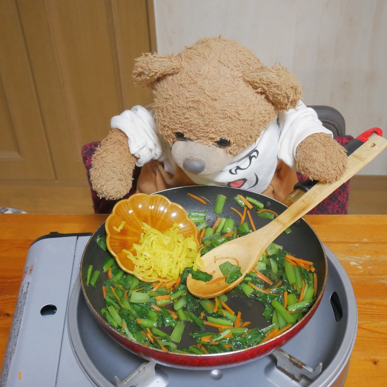 3. 中火で温めたフライパンにごま油をひいて小松菜とにんじんを炒める。1分半ほど炒めてしんなりしてきたらAを加えて1分ほど炒める。