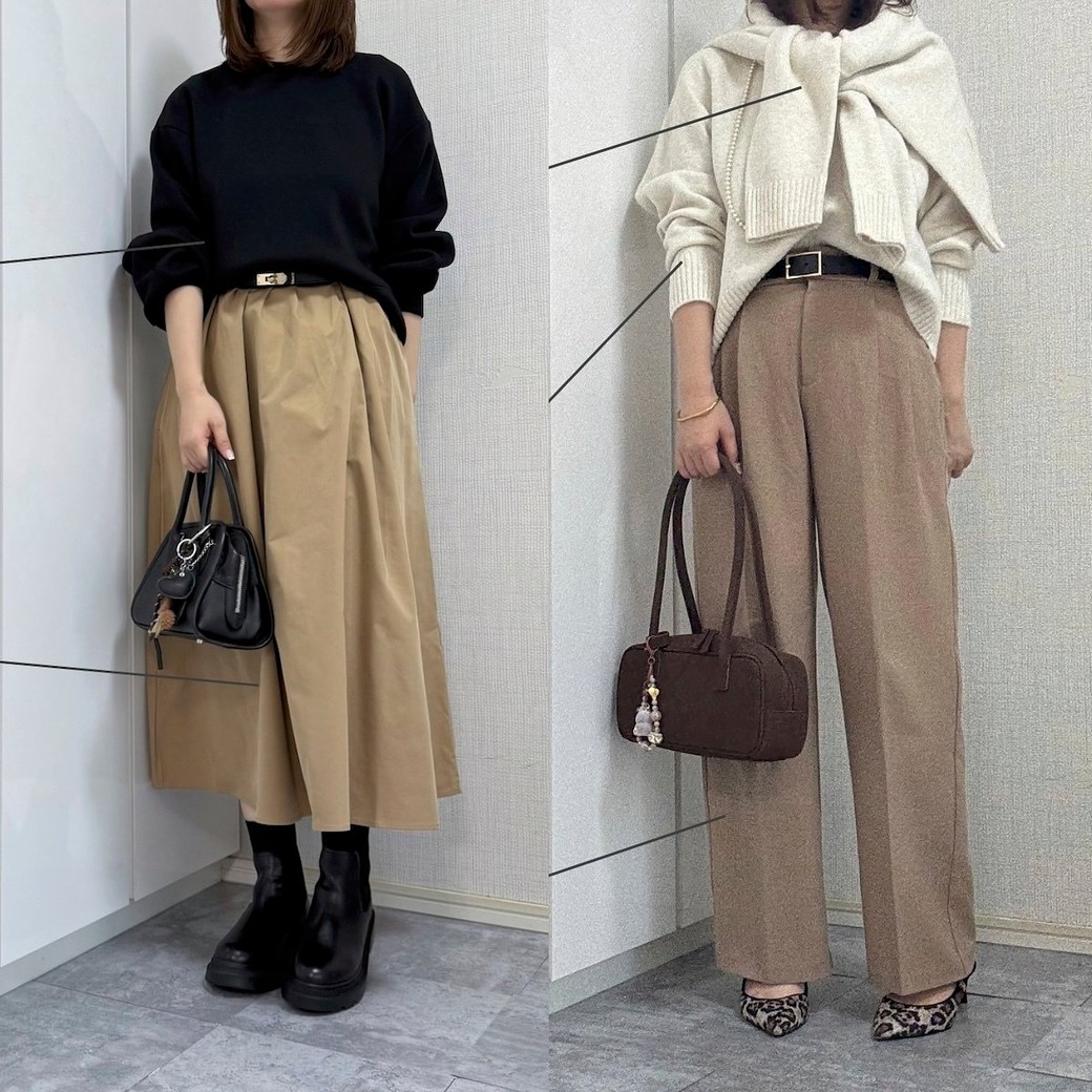 ニットの着丈も長すぎず、すっきりとした印象で野暮ったさが出にくいのもポイントです。