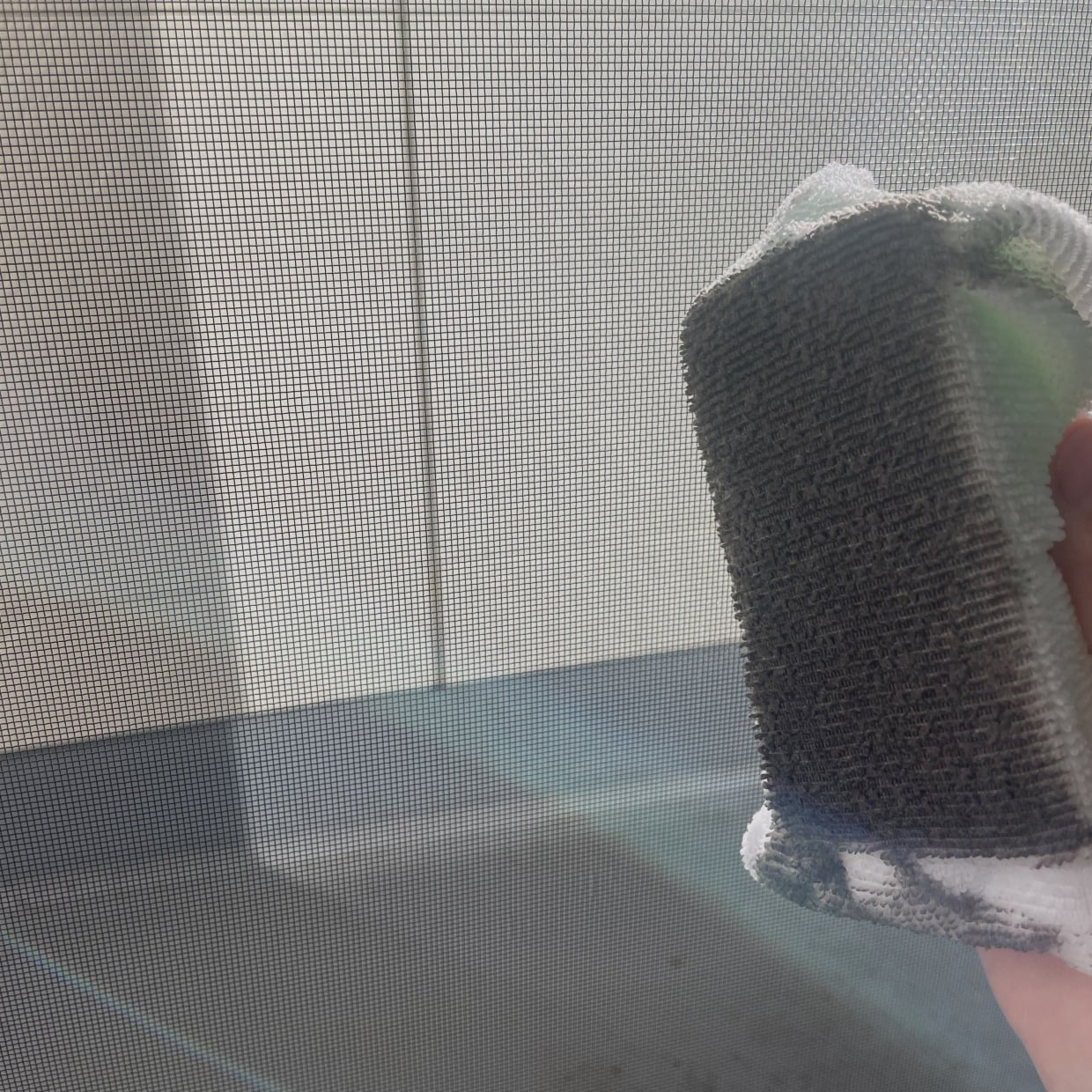 網戸は、クロスだとよれてしまい、拭きにくさを感じることもありますよね。そんなときは、少し大きめのスポンジにクロスをくるっと巻きつけて使うのがおすすめです。表面が平らになり、角やフチまでしっかり届いてキレイに仕上がります。