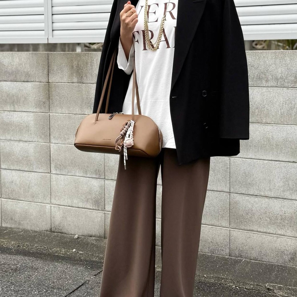 黒のジャケットに白インナー、茶のパンツを合わせたコーデは、大人カジュアルにぴったりの落ち着いた配色です。