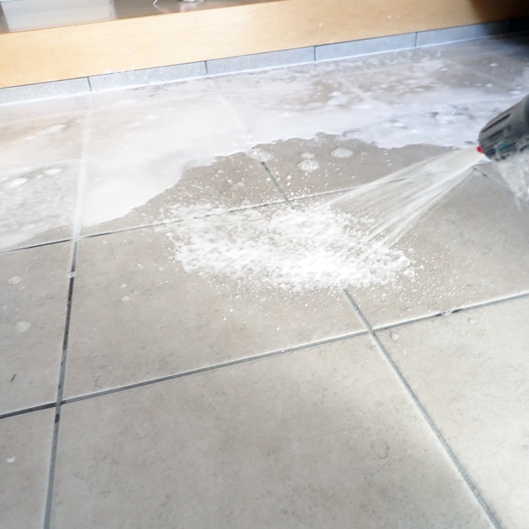 乾いた状態の玄関に泡を噴射すると、流れることなく汚れに密着します。これこそが、泡タイプスプレーの強み。シュワッと広がる泡が汚れに密着して、表面の黒ずみをマイルドに浮かせてくれます。玄関タイルの目地にも、泡がスッと入っていくのが気持ちいいんですよね。