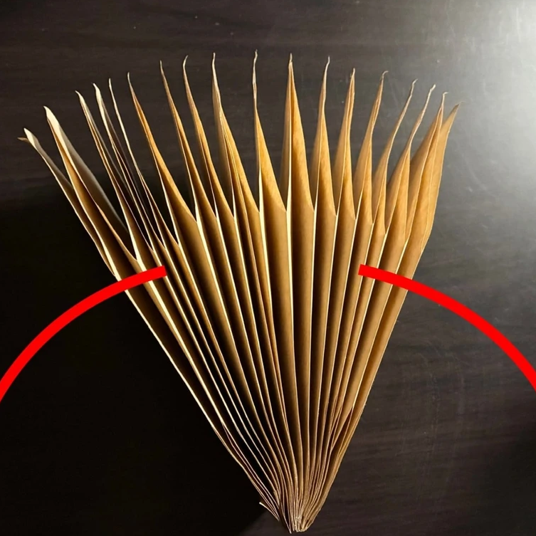筆者は今回、シャープな印象のオーナメントを作るため、茶封筒に写真のような線を引きました。
