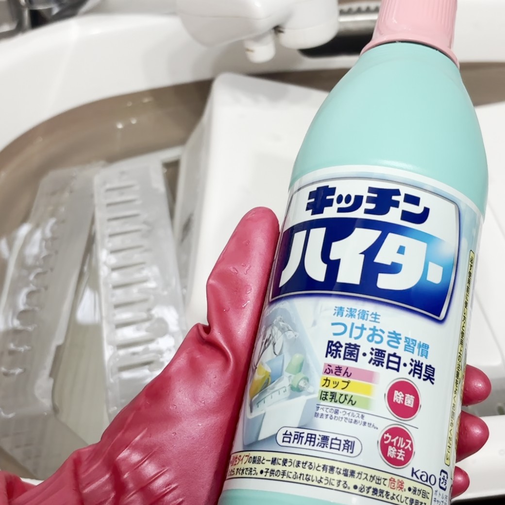 - キッチンハイターは塩素系漂白剤のため、必ず十分な換気をし、ゴム手袋を着用して作業してください。