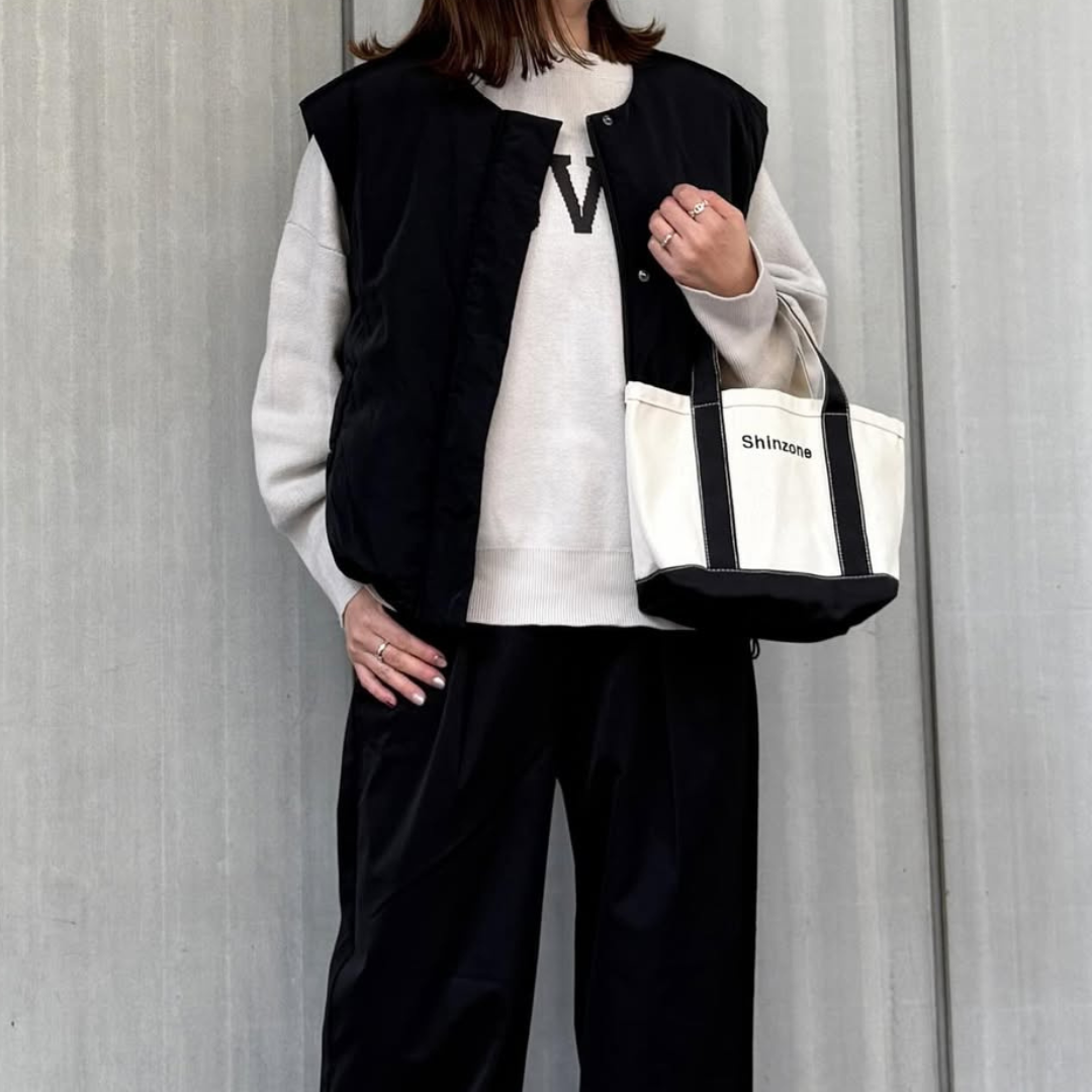 ダウンベストはボリュームが大きいアイテムなので、中に着るトップスやボトムスはスリムなものを選ぶとバランスが取りやすくてGOOD。