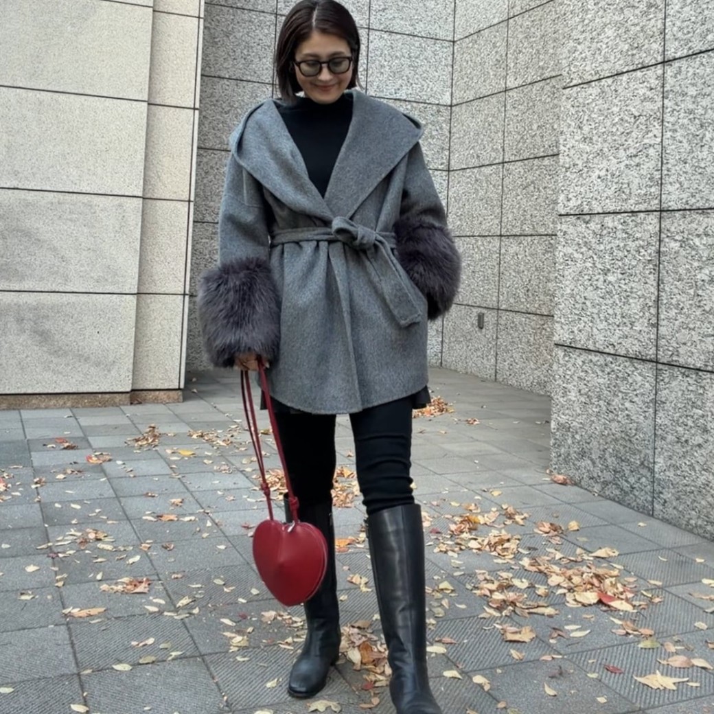 コートはやわらかなグレーを選び、インナーやボトム、足元は黒で統一。
