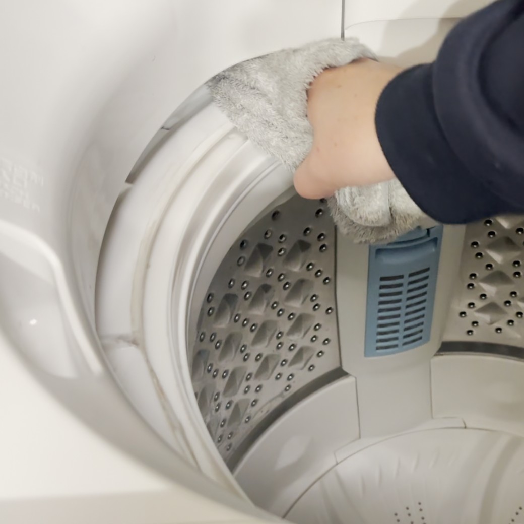 洗濯槽の上部「フチまわり」は、洗剤や柔軟剤の飛び散りに、ホコリが重なって汚れやすい場所です。無理にこすらず、まずは汚れをふやかしてから拭き取ることで、軽い力でも落としやすくなります。