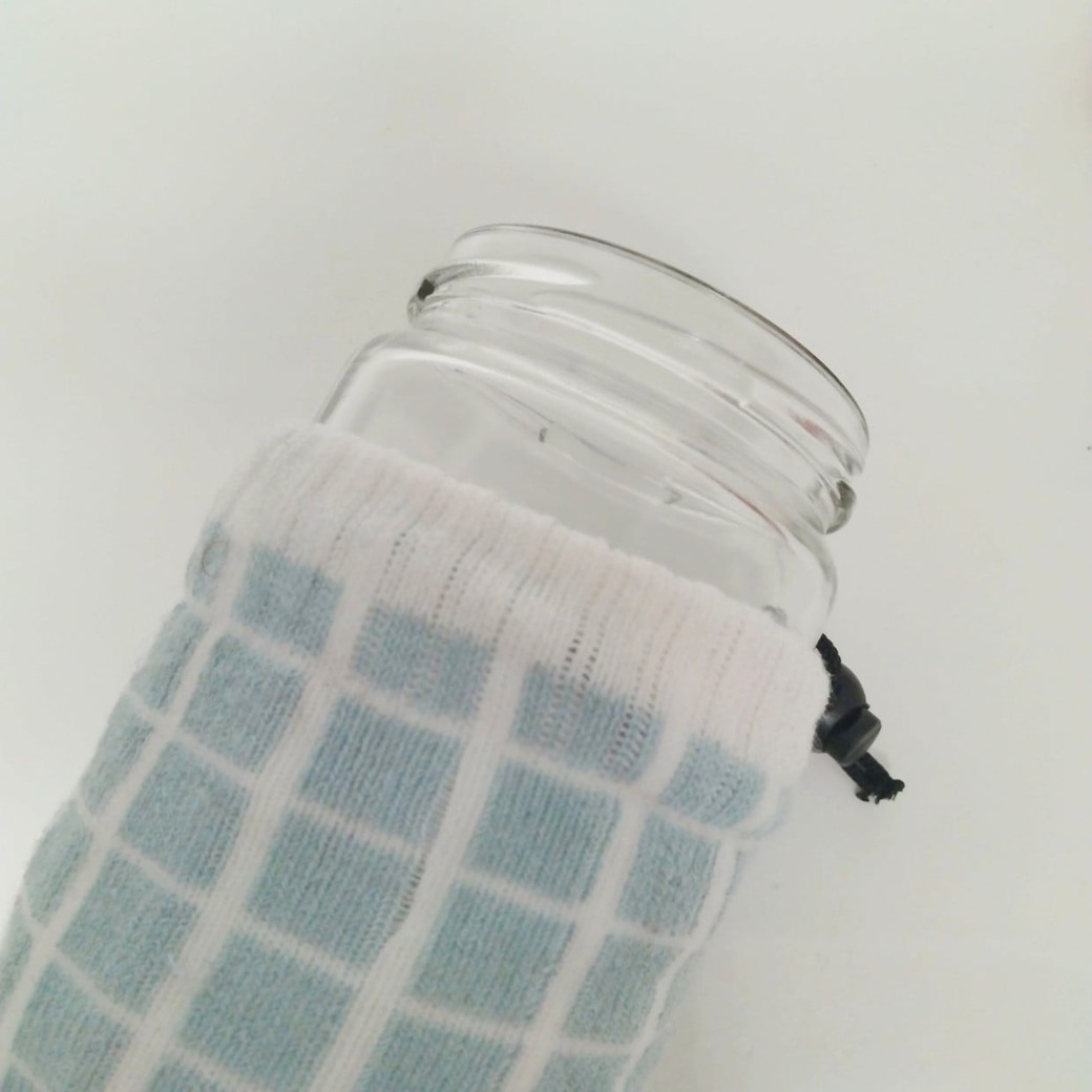 1.ペットボトルカバーを瓶の底にしっかり合わせてはめます。ハンカチは瓶の口に広げ、端が引っかからないようにゆっくり押し込みます。ハンカチの布がしわにならないよう、少しずつ押すと整いやすいです。
