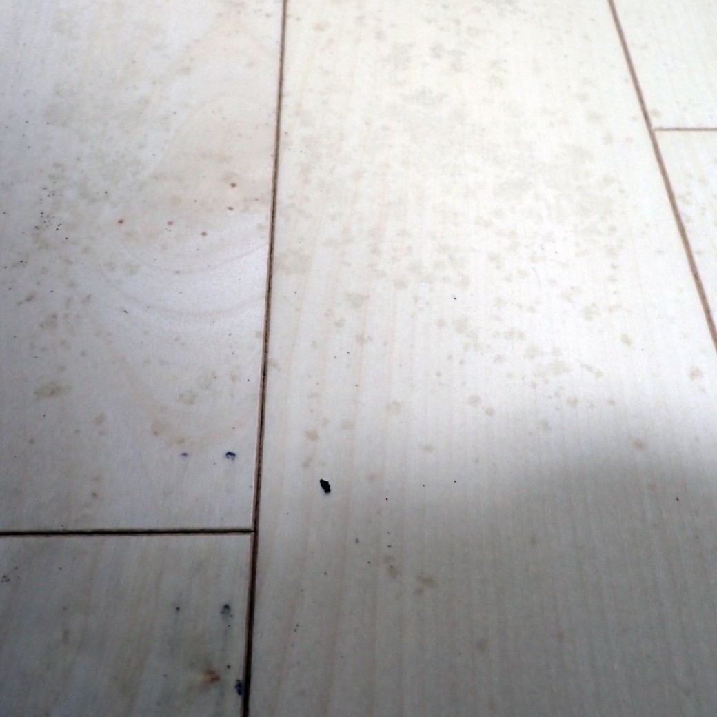 15年間ずっと同じ場所にあったベッドを処分したら出てきたフローリングの汚れ。通常の汚れとは違って、茶色い点々が無数に発生していました。