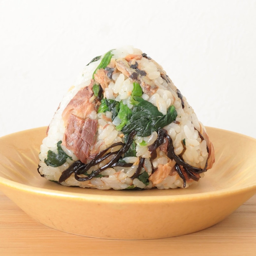 おにぎりの具材に使うのは、DHAやEPAのほか良質なタンパク質も摂取できる「サバ缶」です。そして、鉄分が豊富な「ほうれん草」と、カルシウムなどのミネラルが詰まった「塩こんぶ」も一緒に混ぜ合わせていきます。ほうれん草はゆでたものを使いますが、冷凍食品で代用可能。いずれも保存がきく食材なので、ご都合のよいタイミングで作っていただけます。