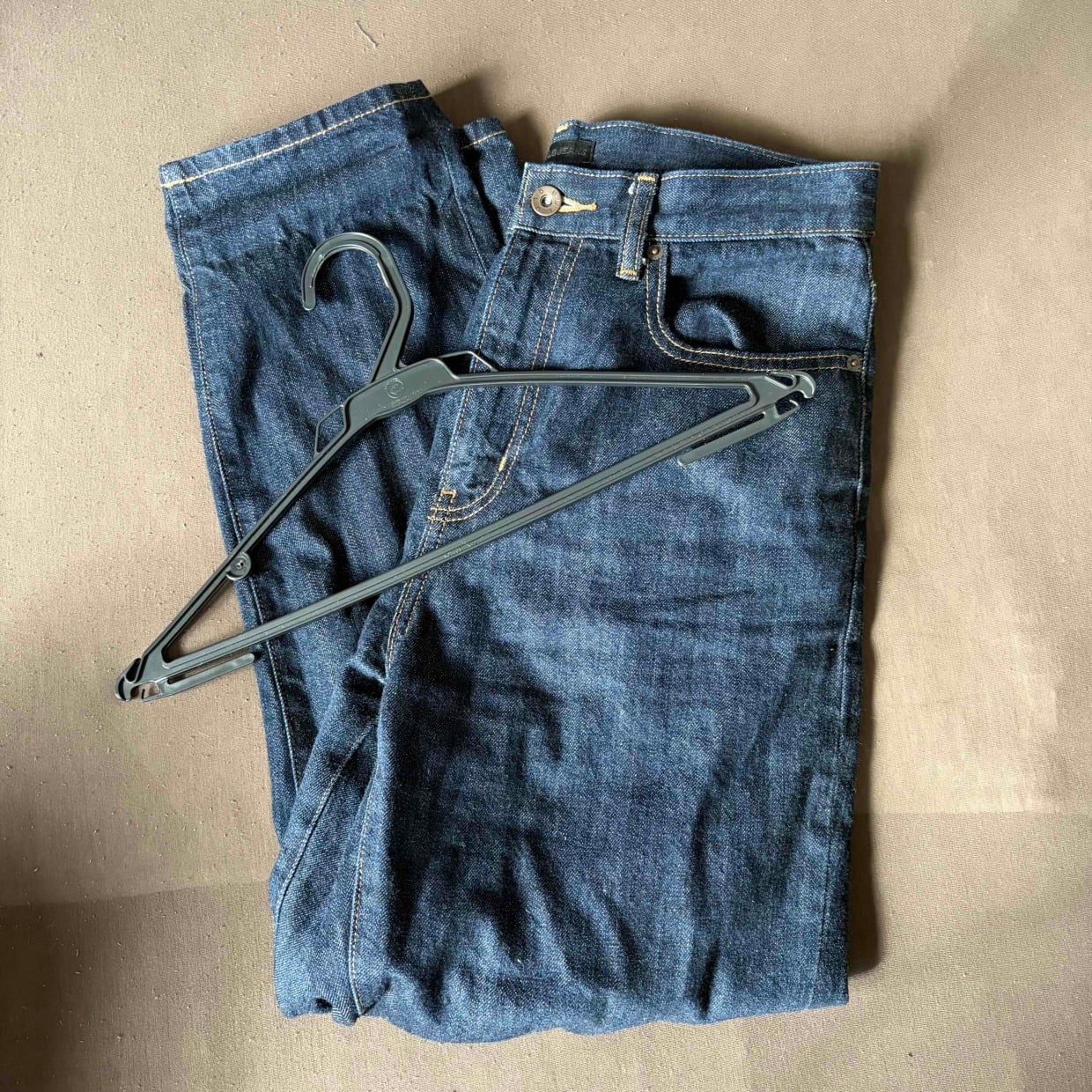 【2】ハンガーごとズボンを左半分に折ってハンガーのフックを下向きにする