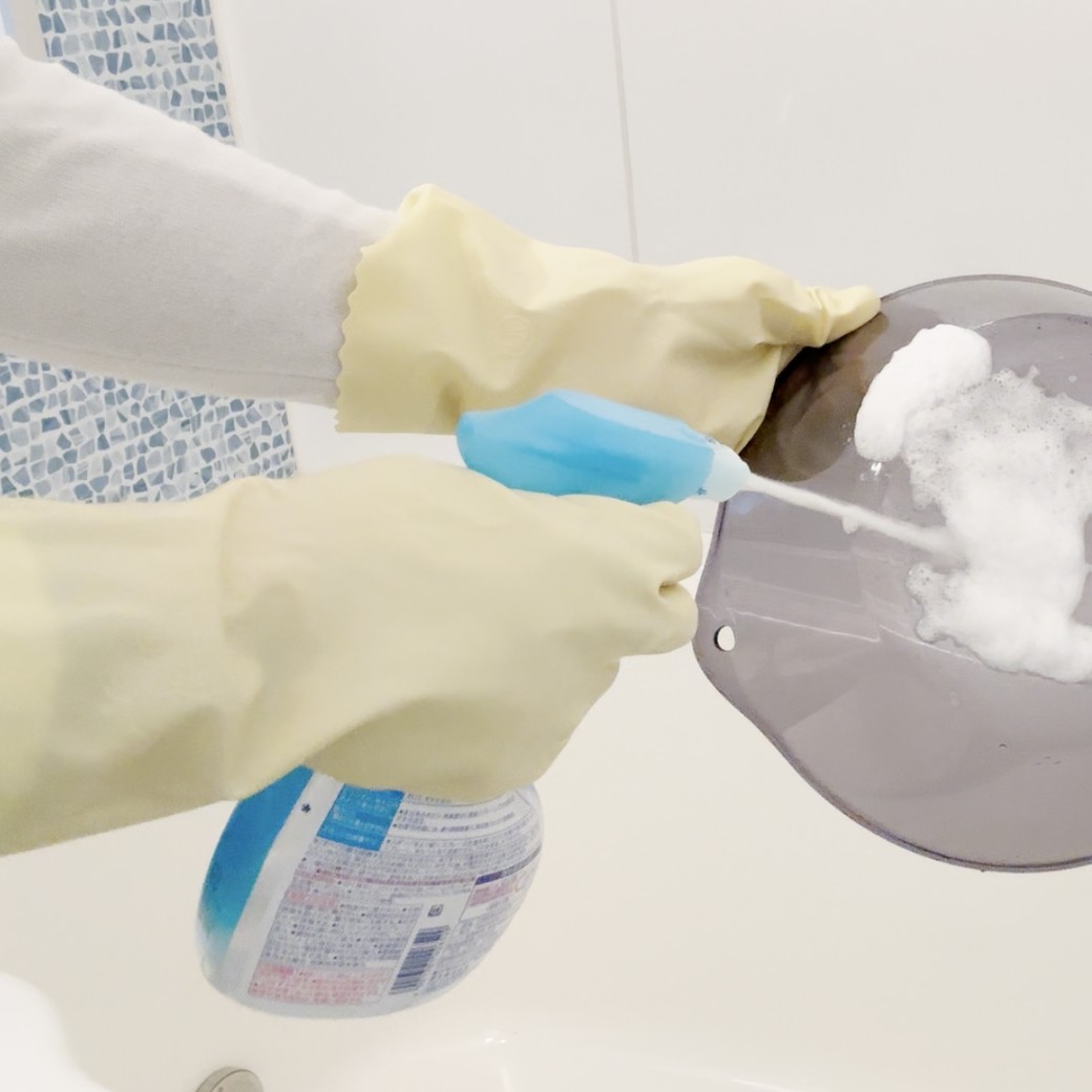 - 洗面器の内側・フチまわりに洗剤をスプレーします。