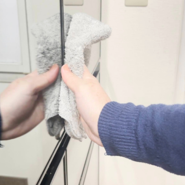 掃除するときは、ウタマロクリーナーを含ませたクロスで、取っ手から扉の端の順に拭き取ります。