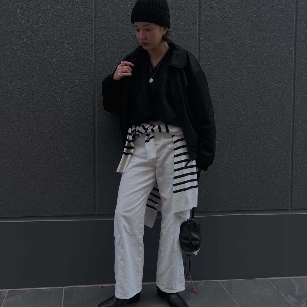 アウターやバッグ、靴、帽子まで黒で統一することで、白パンツの明るさがより引き立ち、全体がきりっと洗練された印象に仕上がります。