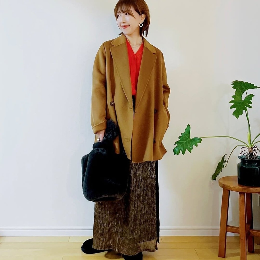 ブラウンのオーバーサイズジャケットにダークブラウンのスカートを合わせた、シックなコーデです。