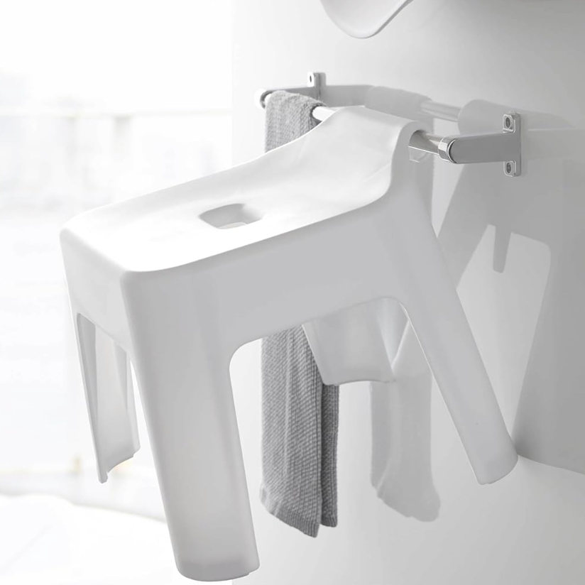 最大の特徴は、背もたれ部分にフックがついていること。お風呂上がりに「タオルバーにひょいっと掛けるだけ」で収納が完了します。 床から浮かせることで風通しが劇的に良くなり、重力で水滴が落ちるので、翌朝にはカラッと乾いています。