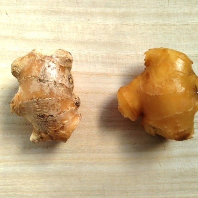 一方で、浸していないショウガ(写真左)は、表面の水分が抜け、やや乾燥した状態になっていました。
