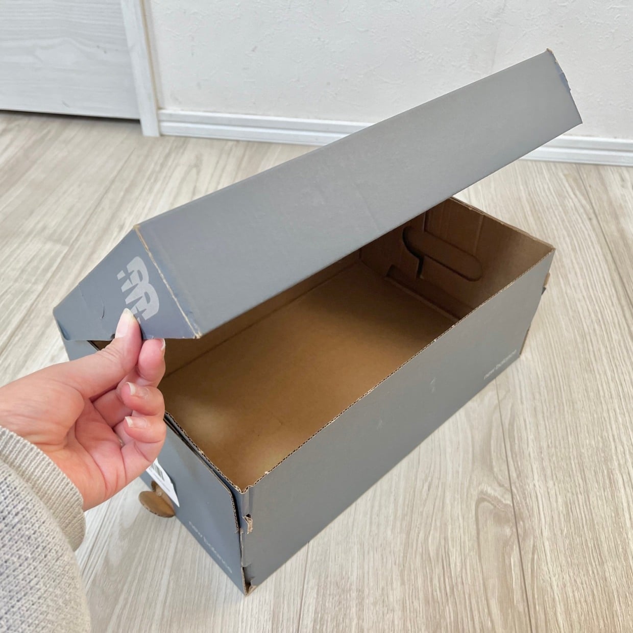 靴箱をそのまま使うと、どうしても「いかにも靴の箱」という生活感が出てしまいますよね。そこでおすすめなのが、箱を裏返して組み立て直すというテクニックです。やり方はとてもシンプル。