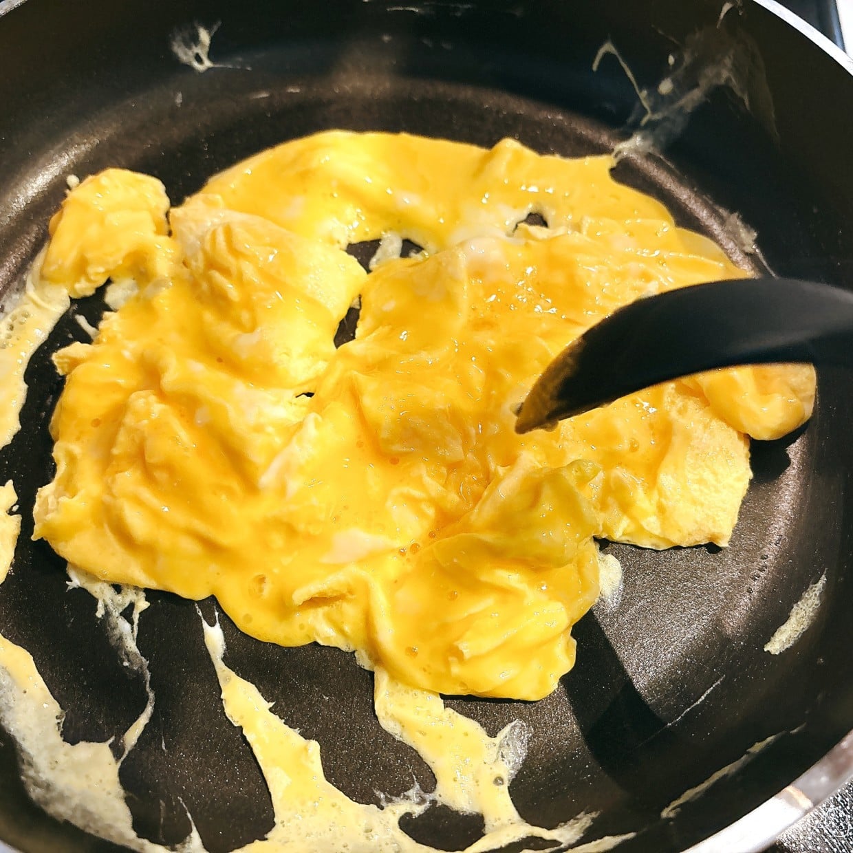 手順3.ふちが固まってきたら、卵をヘラで大きく混ぜて半熟に仕上げます