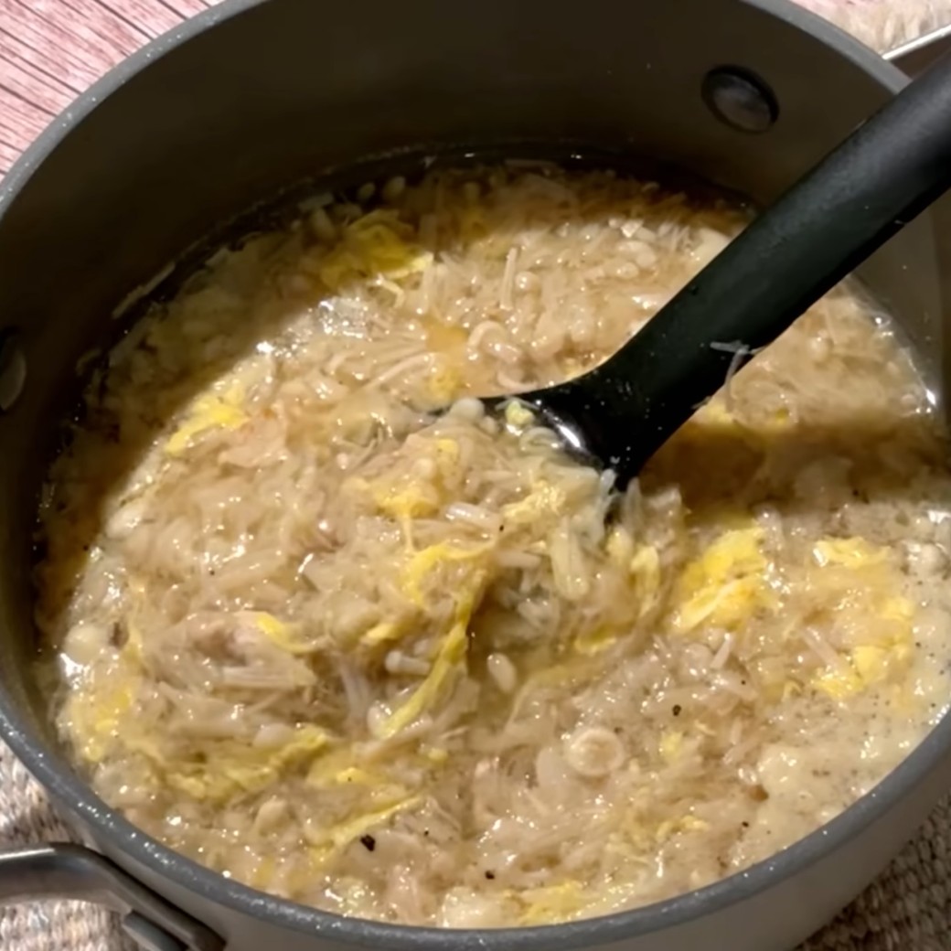 4.水を加え、しょうがと叩いたえのきを入れます。洋風スープの素を加えてください。