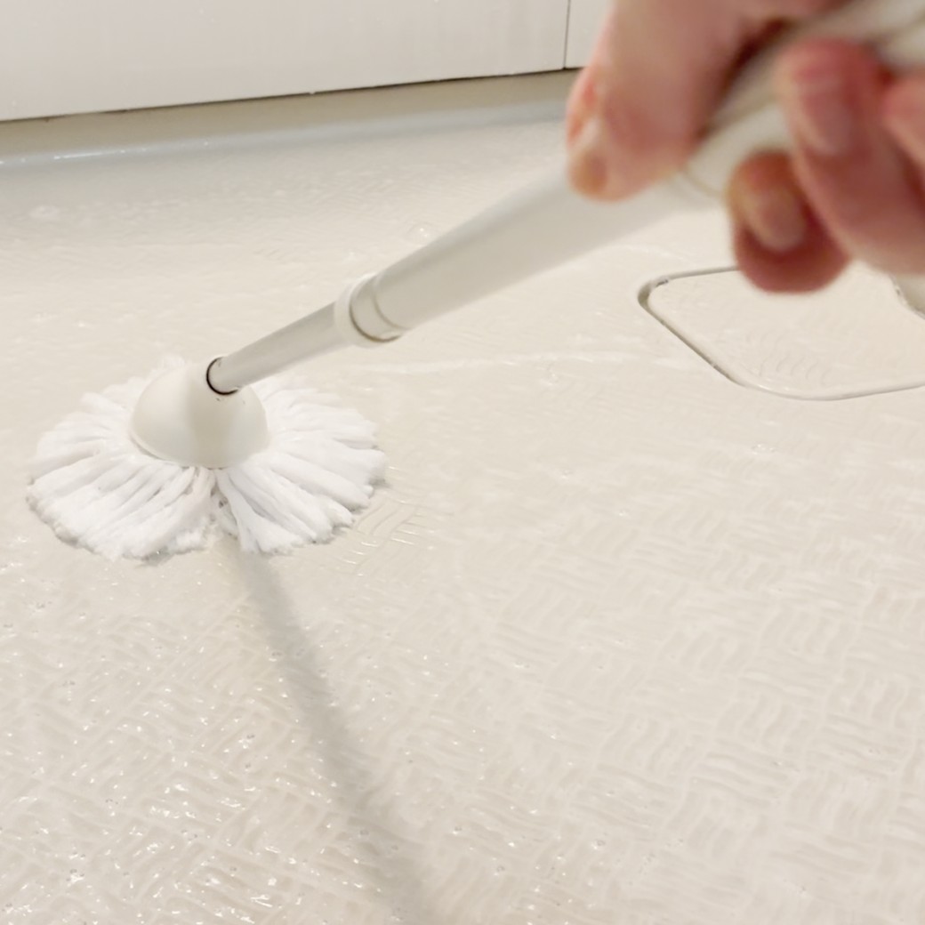 やわらかめの床用ブラシ(またはスポンジ)で溝に沿って軽く広げたら、そのまま数分おいて(目安:2〜3分)、汚れとなじませましょう。