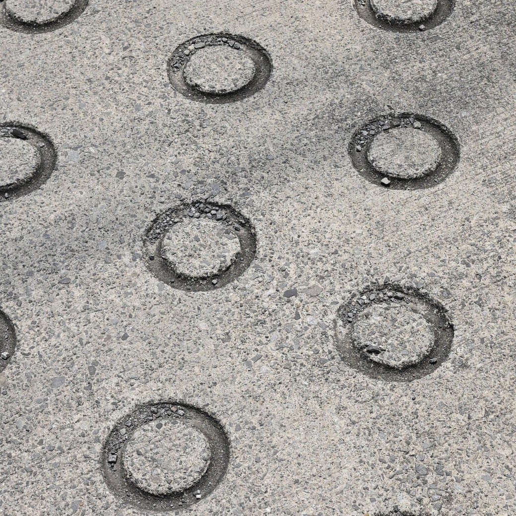 「Oリング」と呼ばれるこの凹凸は、路面の摩擦性を高めるための滑り止め工法の一つです。あえて規則的な「くぼみ」を作ることで、タイヤや靴底との引っ掛かりを強め、雨の日などの転倒やスリップを防ぐ役割を果たしています。