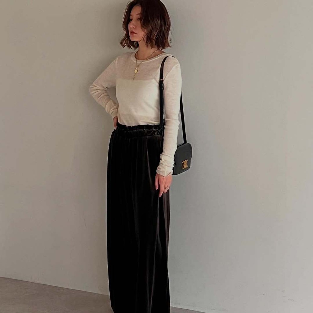 ボトムスにはベロアパンツを合わせることで、上品なツヤと立体感が加わり、コーデ全体に奥行きが出ます。