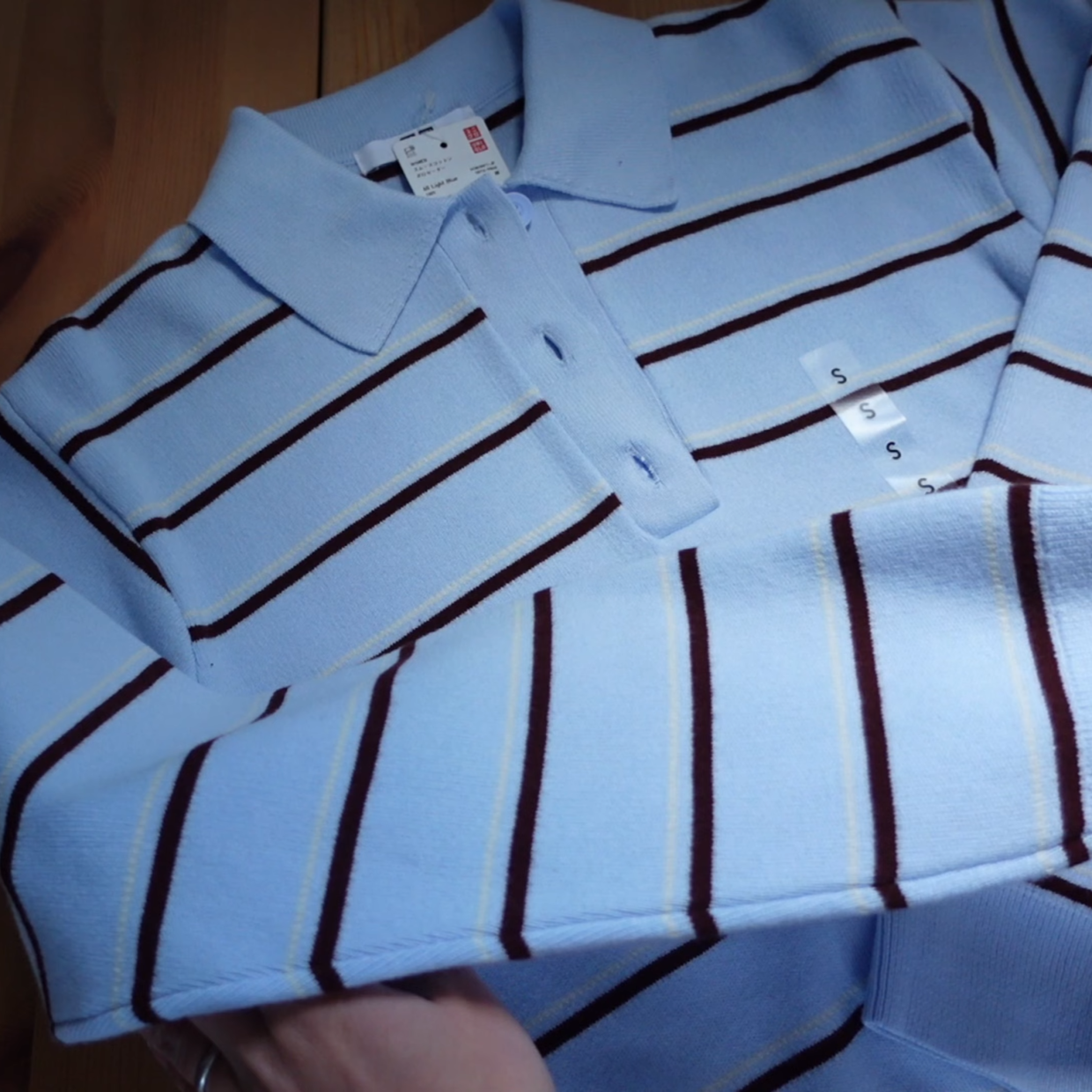 タックワイドパンツにポロセーターを合わせ、全体をブルー系でまとめた、シンプルなカジュアルコーデ。