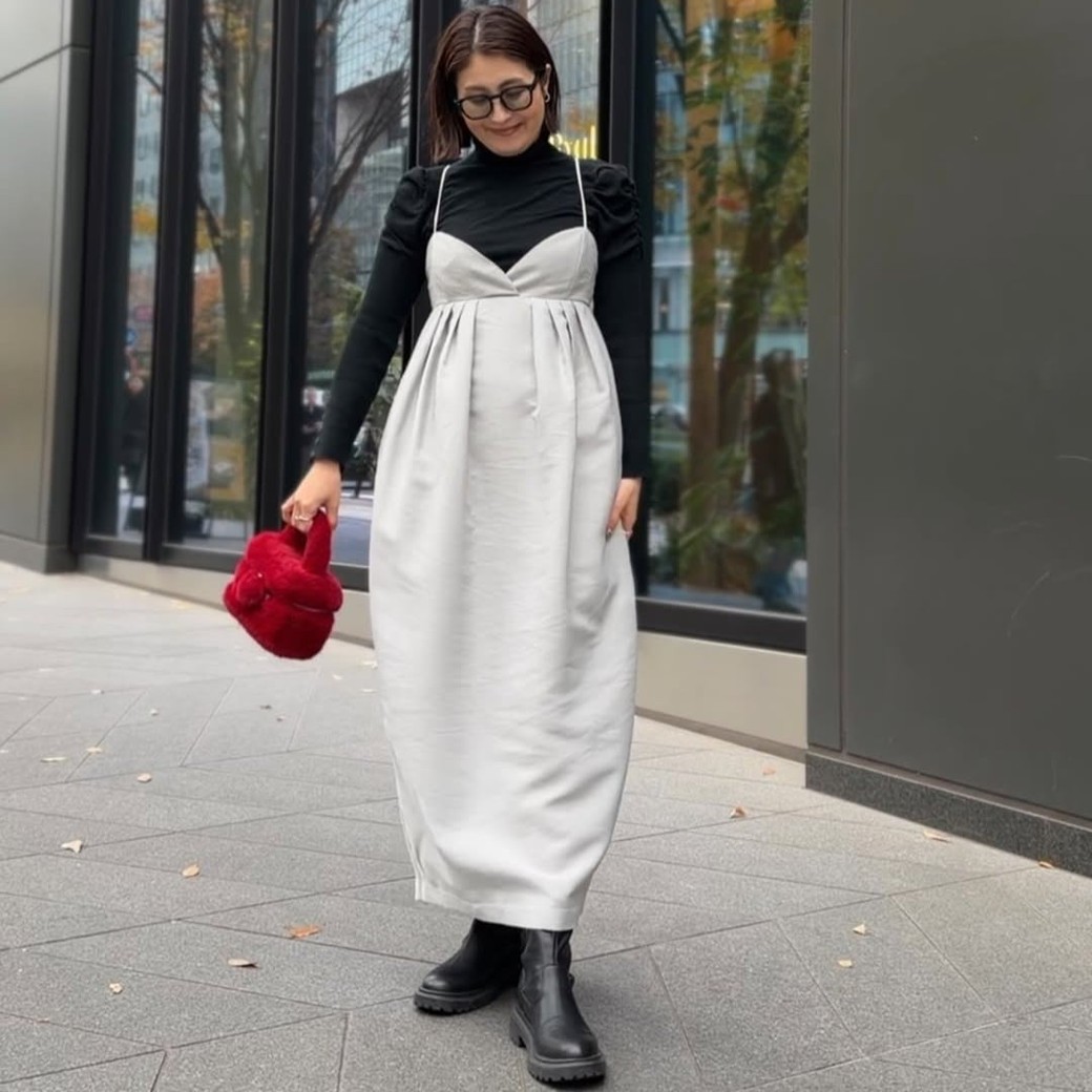 ぽっこりお腹が気になるなら、バルーンシルエットのワンピースをチョイス。