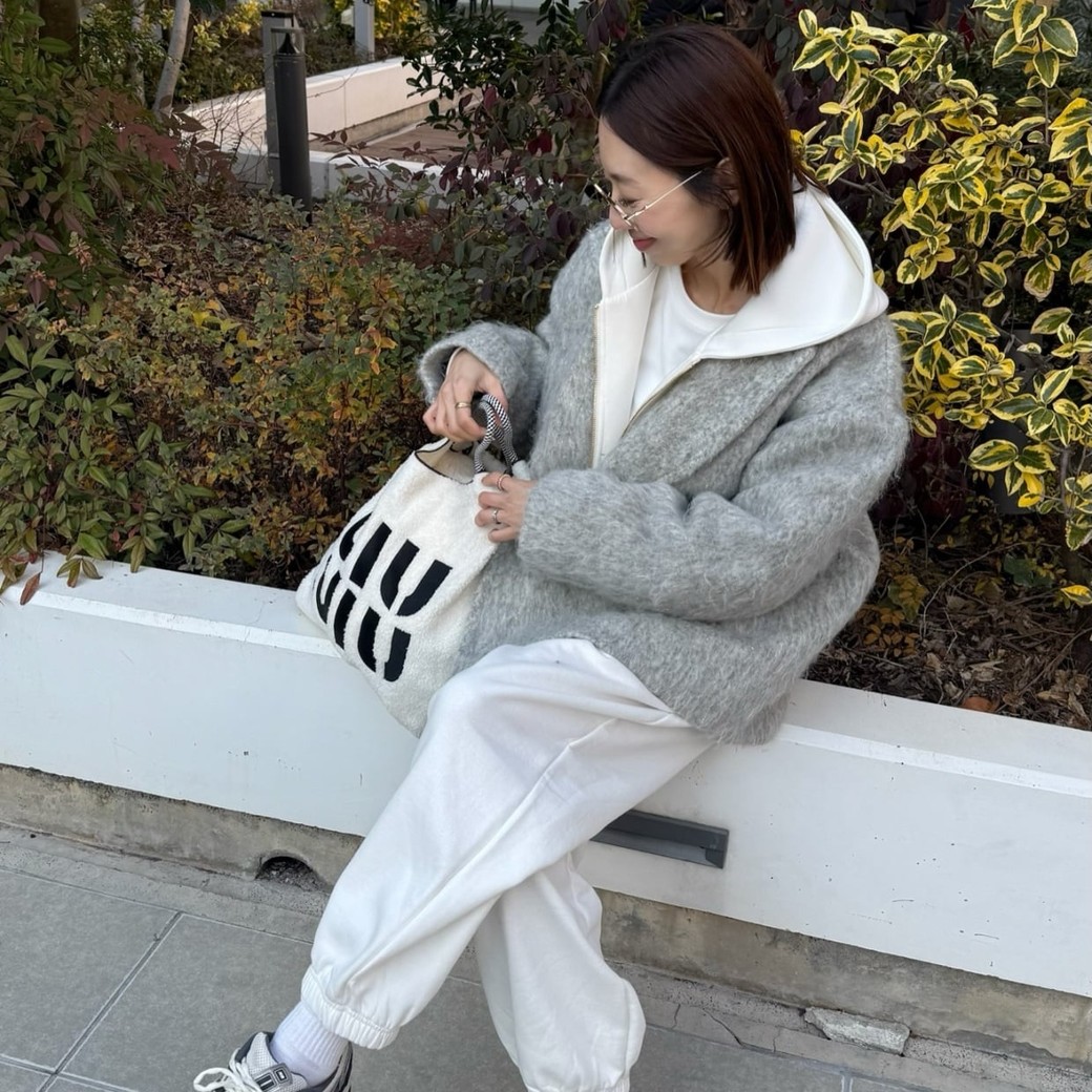 グレーのアウターに、白のインナーとボトムスを合わせた淡色2色コーデは、やさしく上品な印象に仕上がる配色です。