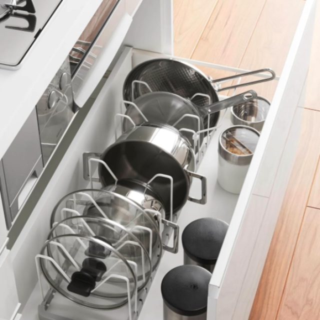 仕切りパーツも3cmごとに調整可能。「深い中華鍋」も「薄い卵焼き器」も、それぞれの指定席が作れます。排水管を避けて設置できるのも、日本の住宅事情を知り尽くした山崎実業ならでは。