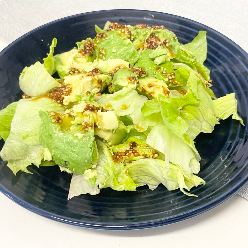 しょうゆとマスタードを混ぜた調味料をアボカドとレタスにかけるだけ。