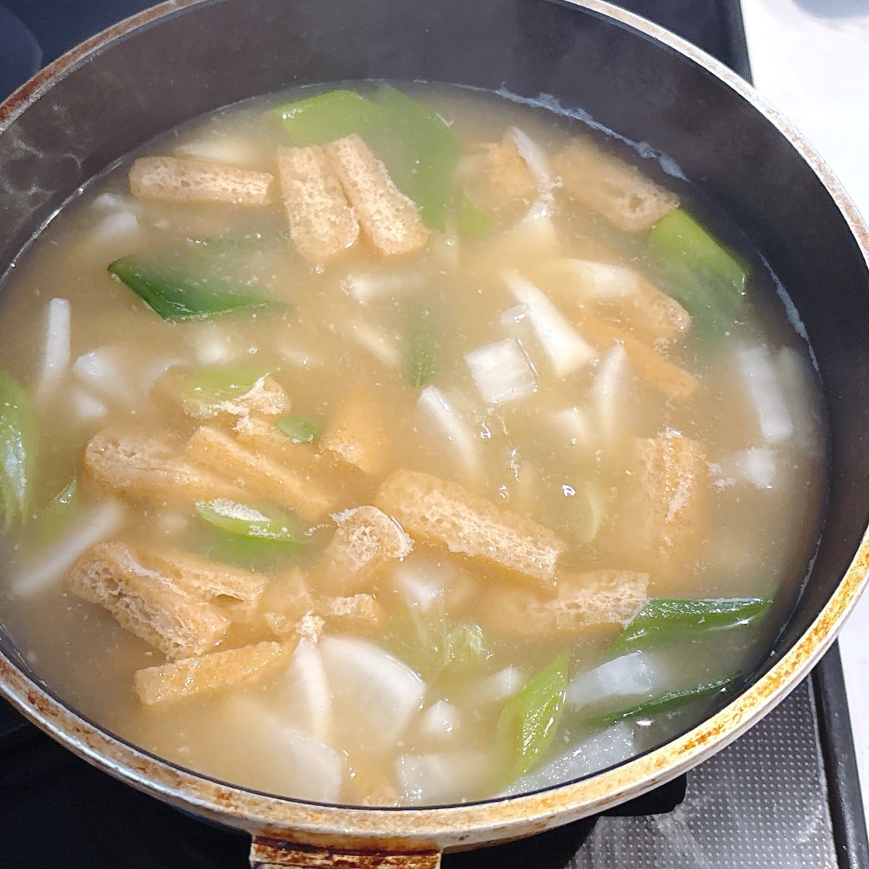 ほぼいつも通りの手順で、めんつゆ入りのみそ汁が完成しました。