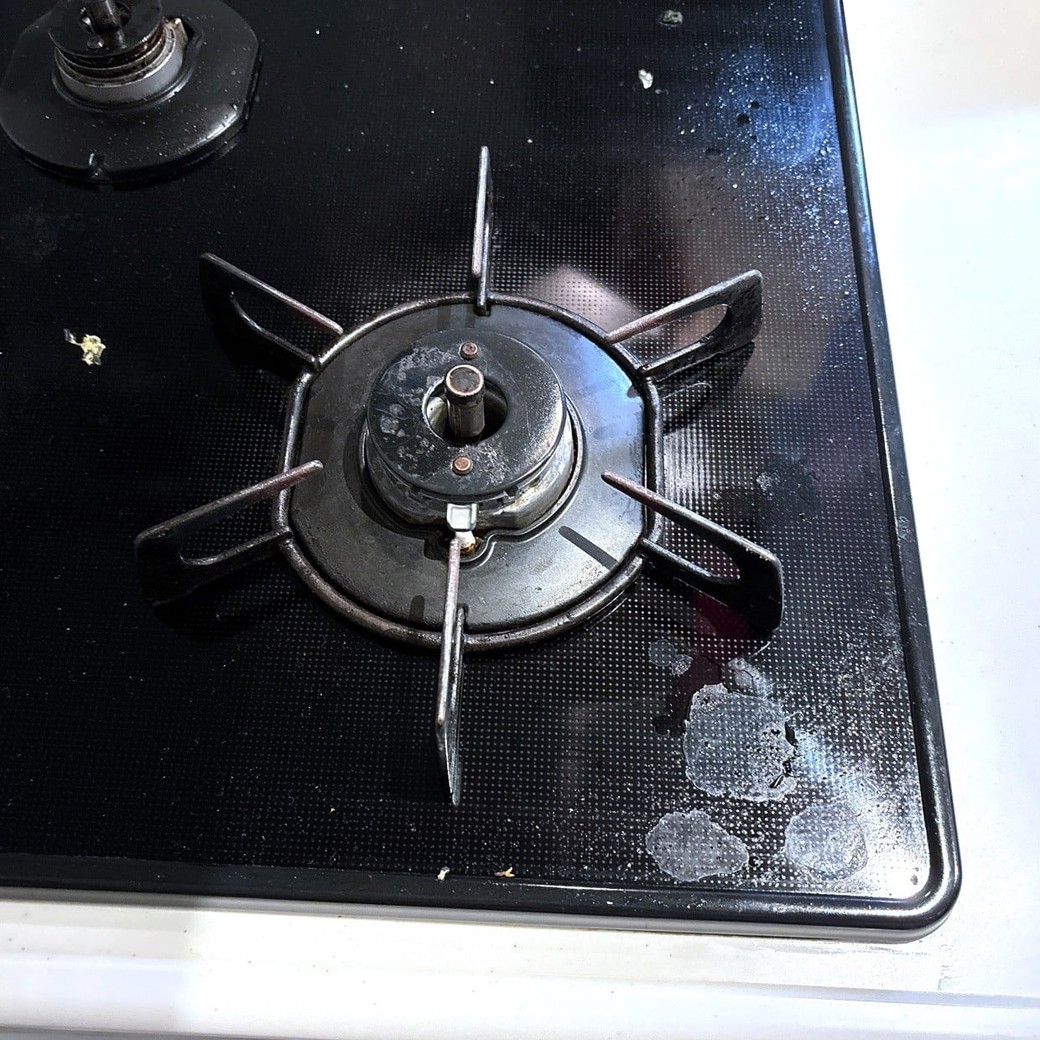 手順1.コンロの五徳を取り外し、天板にマジックリン ハンディスプレーをかけます