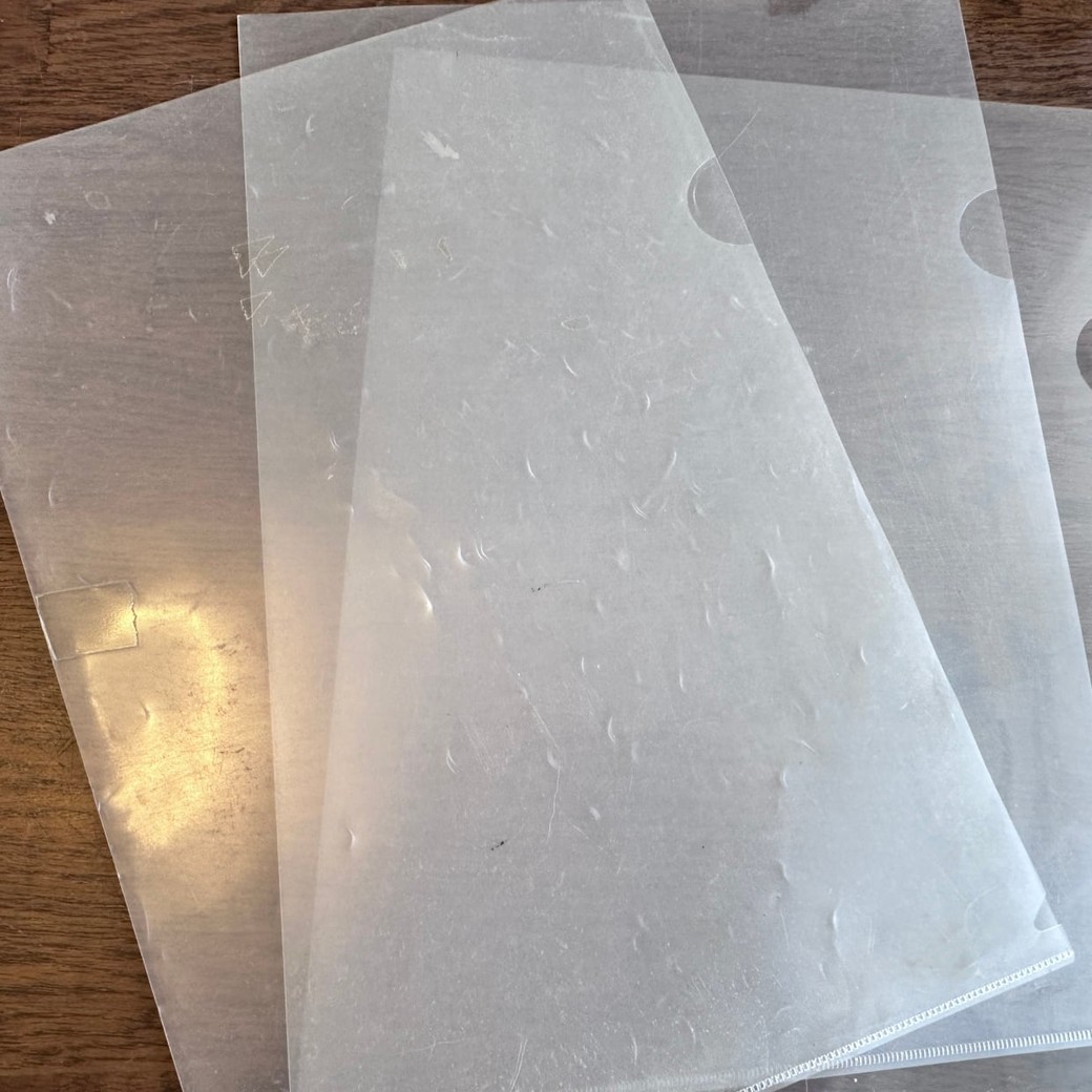 まず、下部の閉じている部分を切り落とし、クリアファイル(ポリプロピレン素材を使用)を開きます。