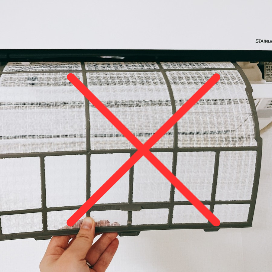 乾かすのが面倒だからと、エアフィルターが濡れたままの状態で取り付けるのは、余計にNGです。エアコンの中はもともと湿気がこもりやすいため、水分が残っているエアフィルターを戻すと、カビが生える原因になります。
