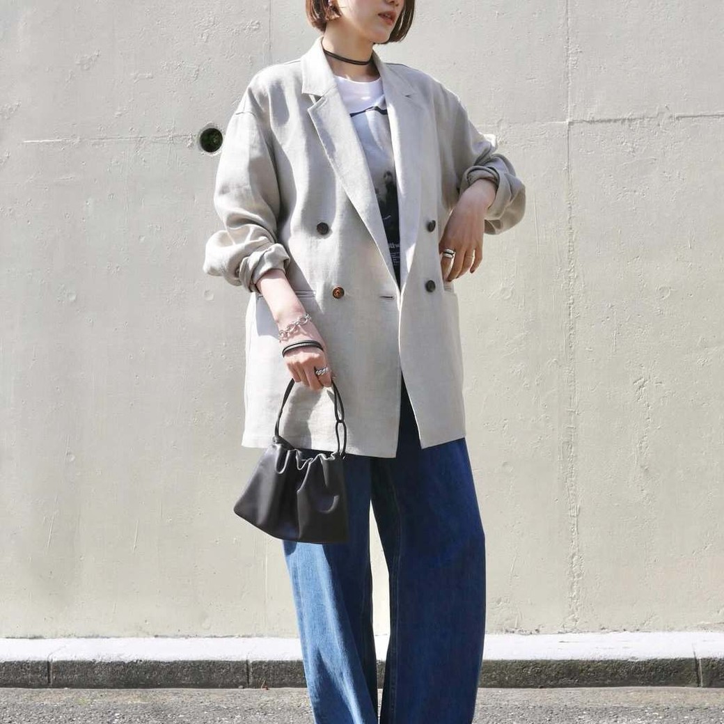 ベージュジャケットをデニムで取り入れることで、きちんと感とこなれ感を両立したスタイルが楽しめます。