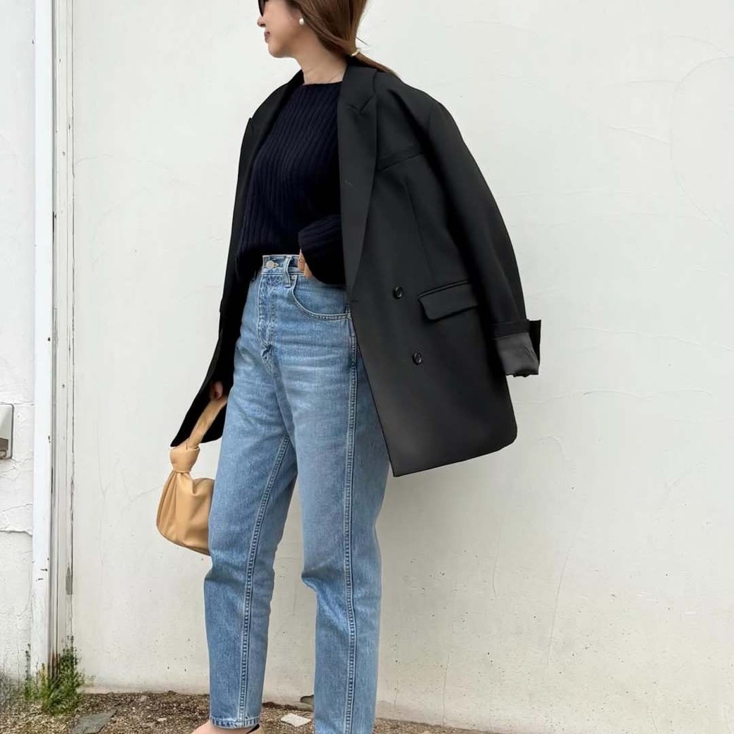黒ジャケット×細デニムでバランスよく