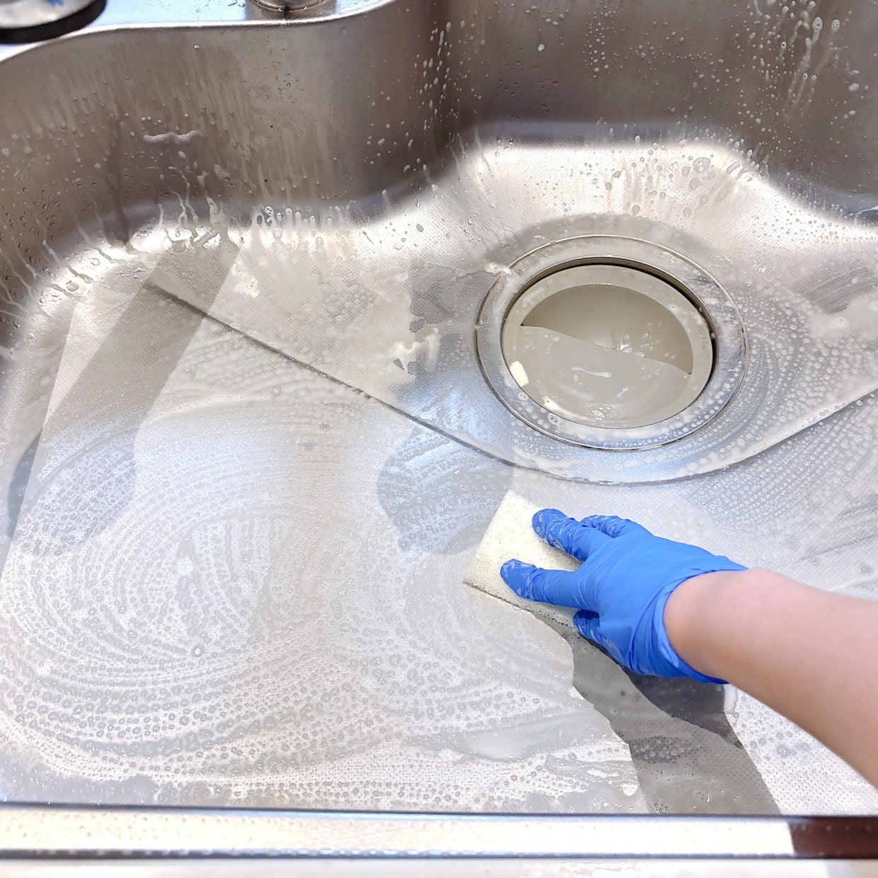 シンク内をくまなくお手入れします。ゴシゴシこするのは避け、やさしく円を描くように汚れを落とすのがポイントです。