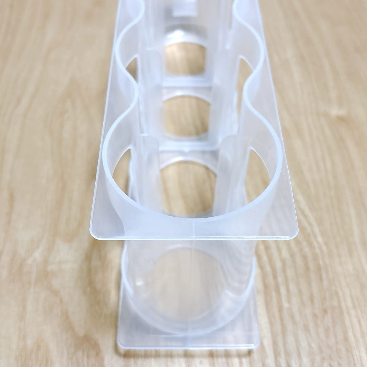 このアイテムを使えば、缶をまとめて立てて保管することができます。さらに、片側に持ち手がついているので、取り出すのもラク! 手が届きにくい冷蔵庫の上段を缶置き場として活用できます。
